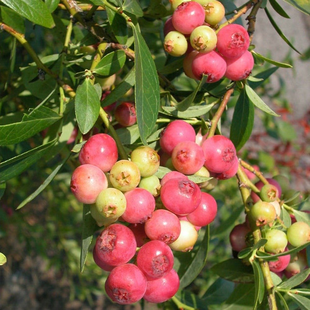 Pink blåbær. Søde pinkfarvede bær der modner i august – september. For bedre frugtsætning anbefales det at plante flere sorter. Flot skiftende løv hen over året. Om foråret rosa blade, om sommeren helt grønne blade og mørkrosa-pink frugter, om efteråret guldgule til orange blade og om vinteren mørkerøde til brune.