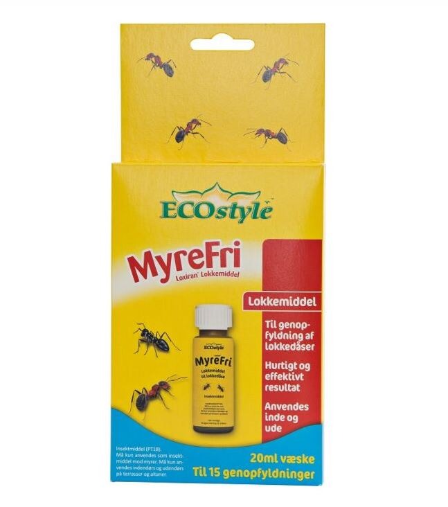 Indeholder 2 stk. genopfyldelige myrelokkedåser og en flaske myrelokkemiddel (Spinosad) med middel til 15 genopfyldninger.