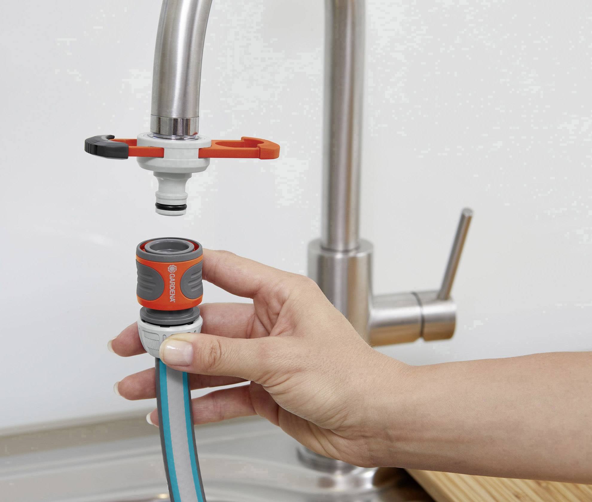 GARDENA-adapteren til indoor-vandhaner gør det muligt at tilslutte GARDENA-systemet til en indoor-vandhane, for eksempel i køkkenet eller på badeværelset. Uanset om vandhanen har et indvendigt eller udvendigt gevind, passer adapteren i begge tilfælde. Takket være adapteren kan Original GARDENA systemet tilkobles og frakobles ganske hurtigt. Vil man sætte adapteren på, må vandhanens perlestrålehoved imidlertid først udskiftes. Dette gøres let ved hjælp af den medfølgende montagehjælp. Adapteren forhindrer ridser i armaturer og passer til vandhaner med indvendigt, M 22 x 1, og udvendigt gevind, M 24 x 1.