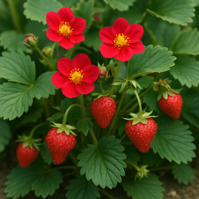 Kompakt jordbærsort med smukke, mørkerøde blomster – i modsætning til de almindelige hvide blomster på traditionelle jordbærplanter. Den blomstrer rigt gennem sommeren og producerer små til mellemstore, søde jordbær, der er fine til både frisk spisning og pynt. Den er velegnet til krukker, altankasser og små haver, og den kombinerer prydværdi med nytte.